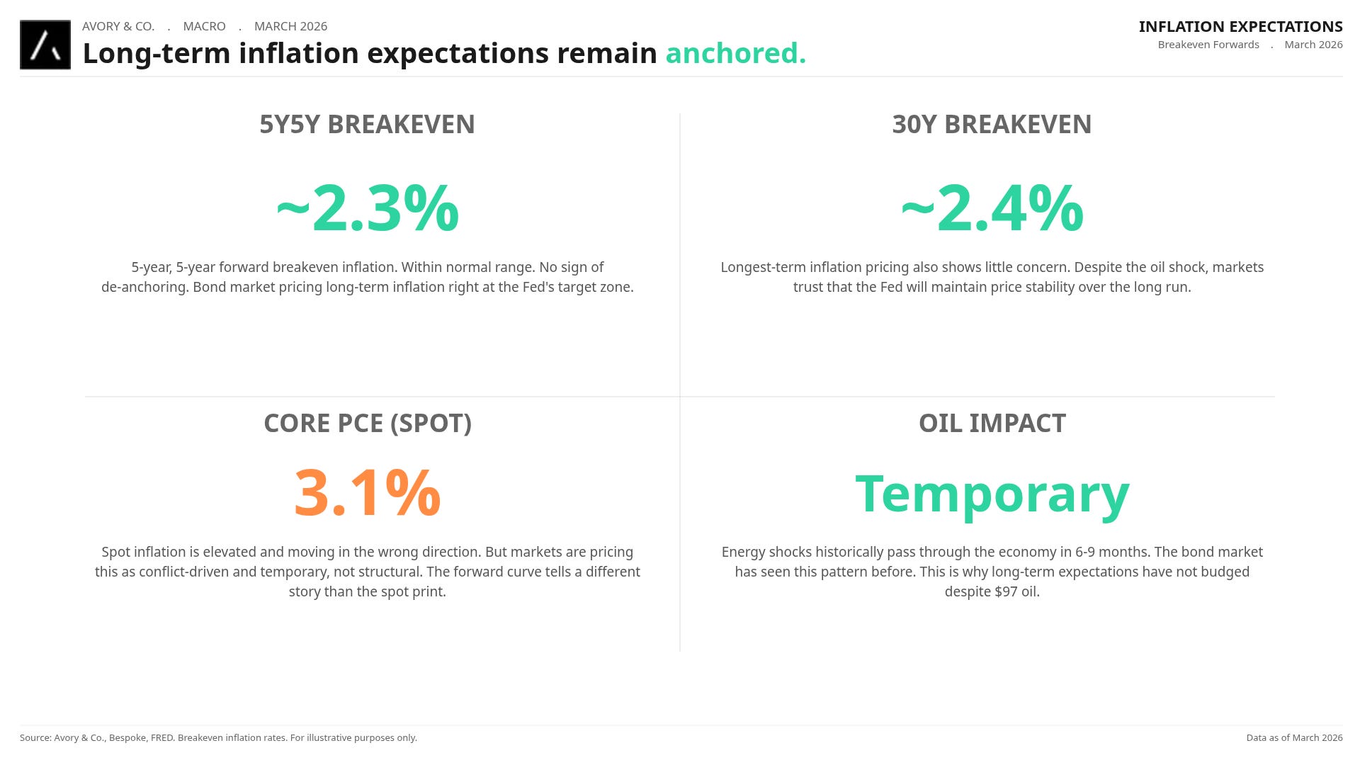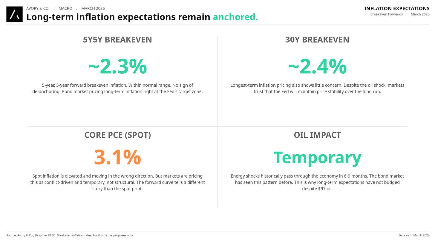 The 5-year, 5-year forward breakeven is sitting around 2.3%. The 30-year breakeven is at 2.4%. Neither is showing any sign of de-anchoring. Markets view the inflation impulse as temporary, tied to the conflict, not structural. Historically, energy shock inflation passes through in 6-9 months. The bond market is saying this and we agree.