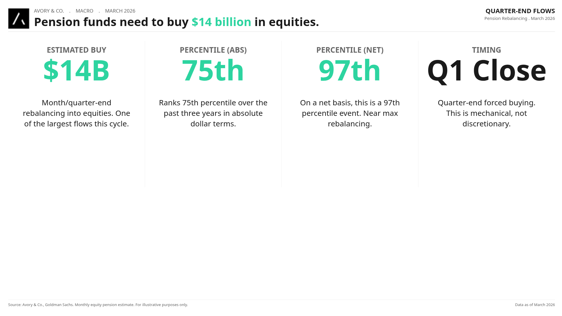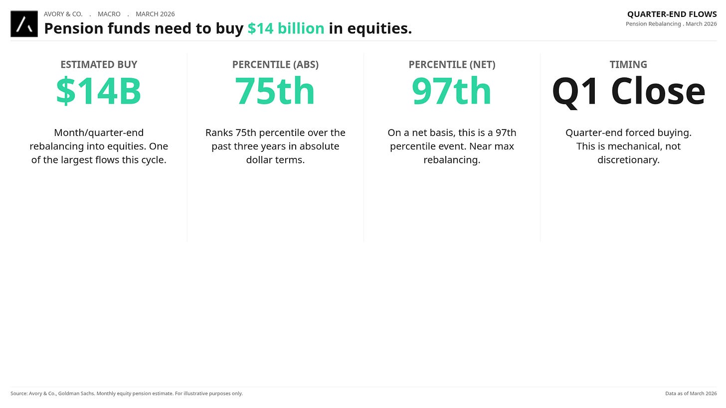 Goldman Sachs estimates $14B in quarter-end rebalancing. 75th percentile absolute, 97th percentile net. This is mechanical, forced buying heading into Q2. Not a bad setup here.