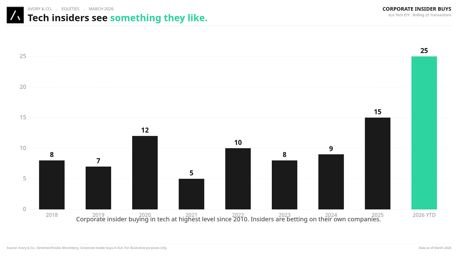 Corporate insider buys in tech at 25 transactions , highest since 2010. When insiders buy, they are betting their own money. This is skin in the game.
