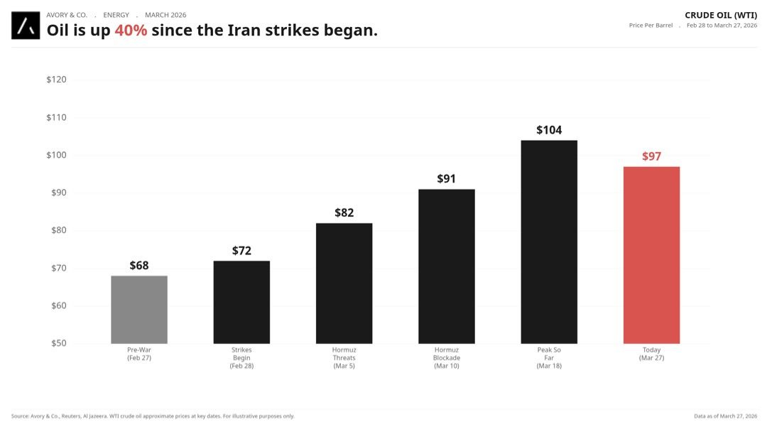 WTI went from ~$60 pre-war to a peak of $104 on March 18, and has since pulled back to ~$97. As I’m writing this, it’s moved about $5, so take that as you will heading into the weekend.