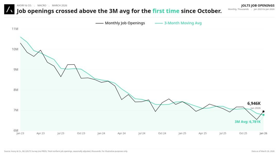 JOLTS job openings at 6,946K, pushing above the 3-month moving average for the first time since October 2025. The labor market is stabilizing and potentially inflecting. Lets see.