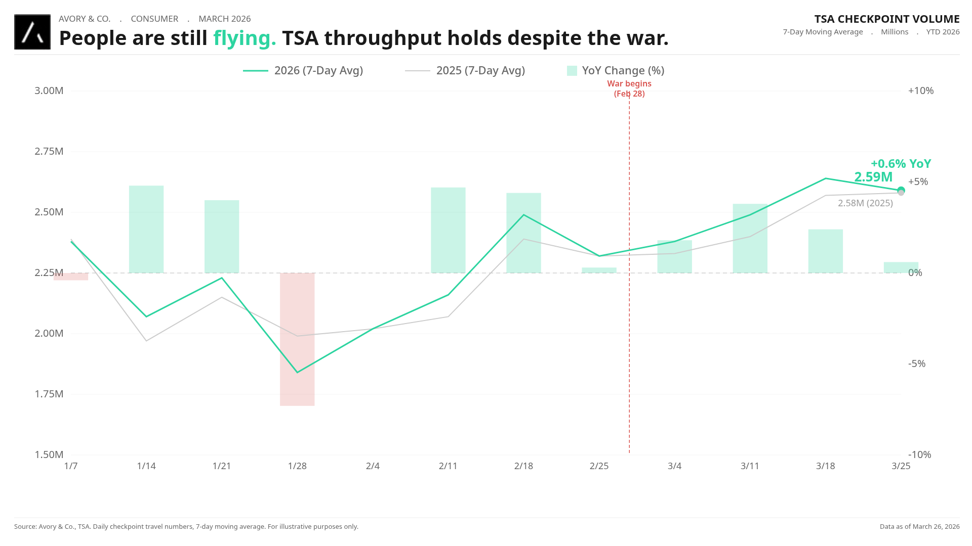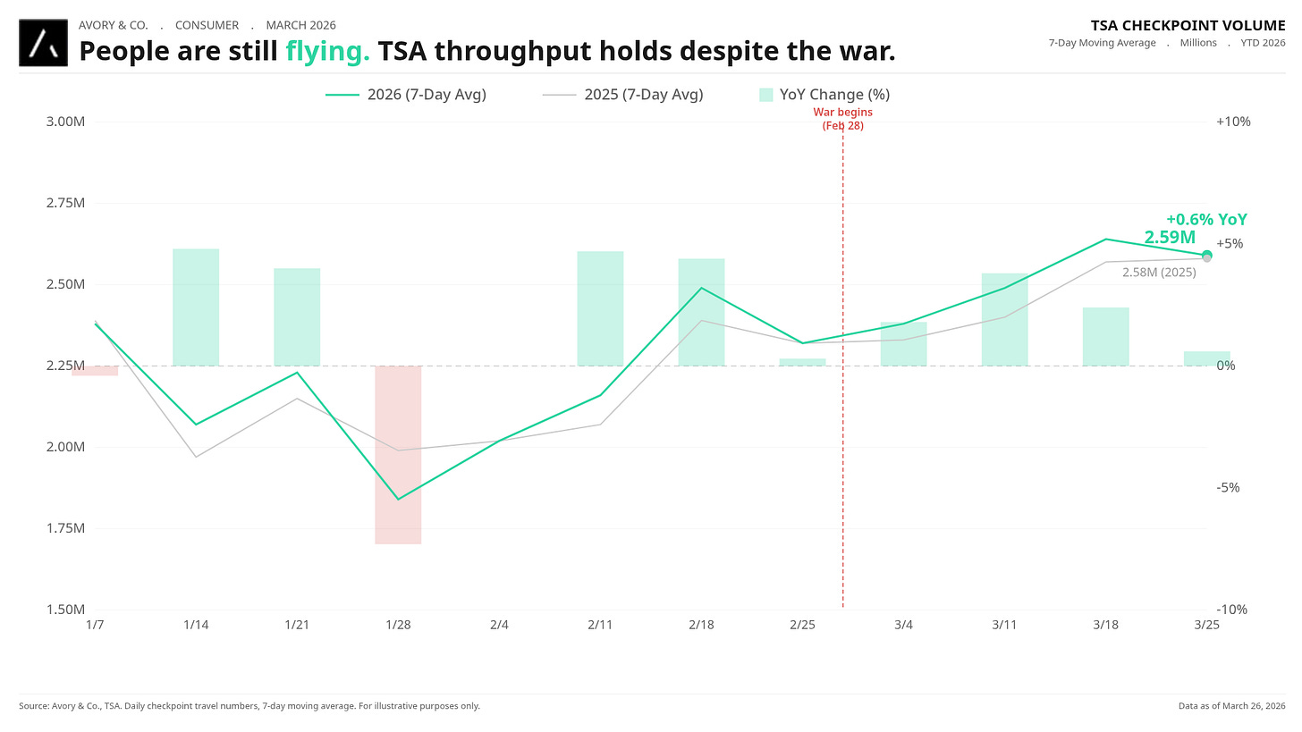 TSA checkpoint data through March 26 shows the 7-day moving average at 2.59M passengers, still running +0.6% above the same period in 2025. The consumer is not pulling back on travel.