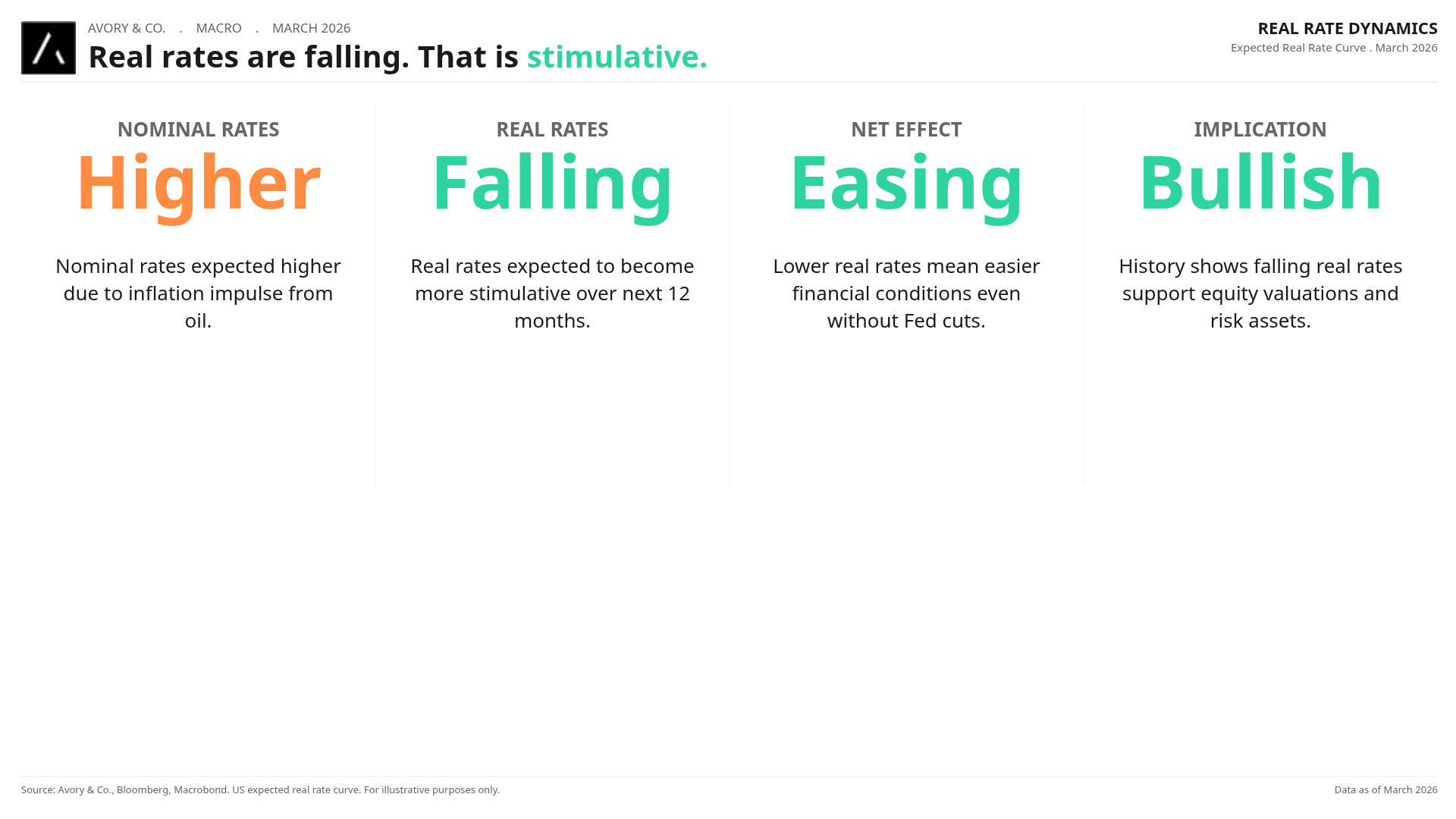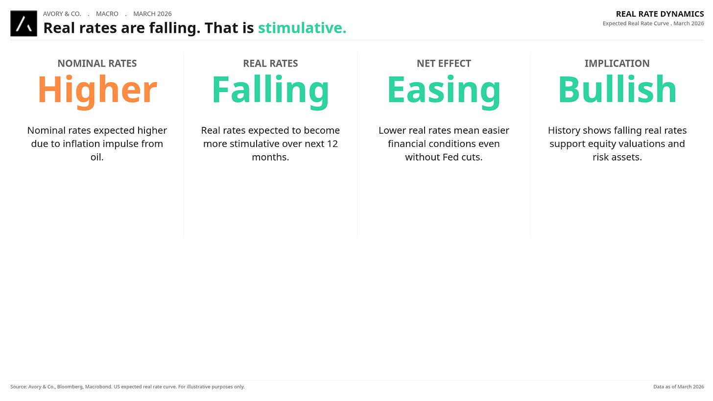 While nominal rates are expected higher, real rates are falling, making financial conditions more stimulative even without Fed cuts. The inflation impulse is paradoxically making the backdrop more accommodative. Strange how that works.